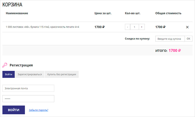 Вы можете заказать товар в нашем интернет-магазине полиграфической продукции двумя способами: через корзину или с помощью быстрого заказа.